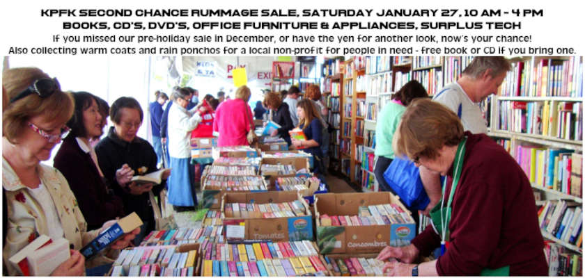 KPFK is hosting a second round of our rummage sale of books, CDs, DVDs, and surplus office furniture, appliances and broadcast tech at 3729 Cahuenga Blvd. West, Studio City 91604, as we prepare for our move. We're also collecting warm coats and rain ponchose for needy people for a local non-profit. Donate a coat or poncho, get a free book or CD!