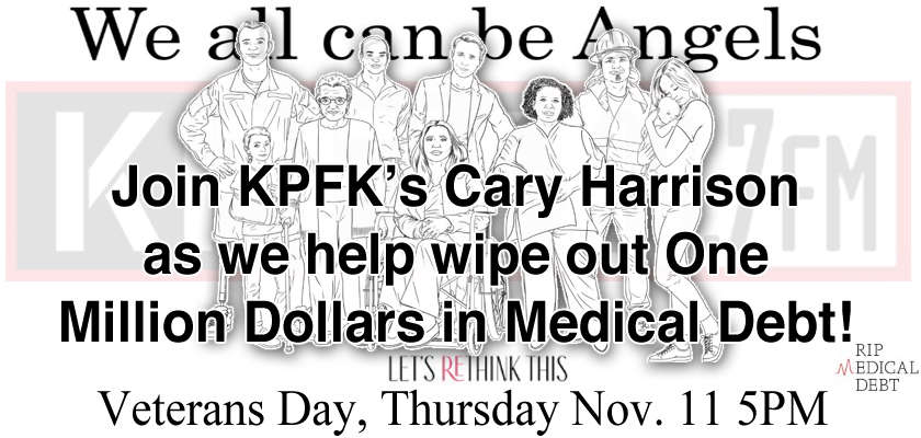 Join KPFK’s Cary Harrison Veteran’s day, Thurs, November 11 at 5 PM PT in a first-ever campaign as KPFK looks to abolish $1 Million dollars in Los Angeles medical debt in 1 hour!