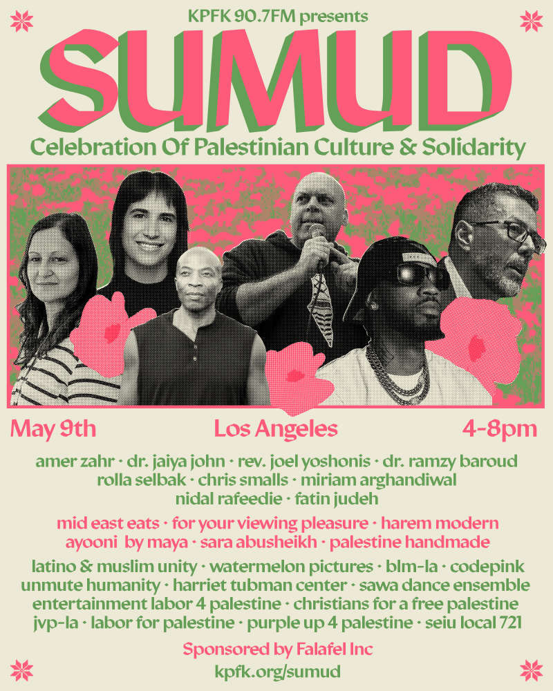 Six days before the 78th remembrance of the Nakba, KPFK 90.7 FM is gathering Palestinian journalists, labor leaders, entertainment organizers, educators, filmmakers, and faith communities for an afternoon and evening in the Mid-Wilshire area of Los Angeles.